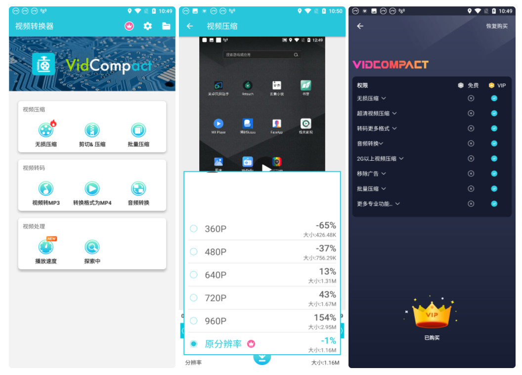 vidcompact視頻轉換器是一個可以讓用戶在手機上進行視頻格式轉換的工具,內置的強大的轉換引擎,就算是手機的性能也能做到超快速的視頻轉換。支持市面上多種主流格式之間的相互轉換,并且操作起來非常簡單,只要導入視頻就可以一鍵完成操作。同時還可以對視頻進行無損壓縮,由于手機的儲存空間有限,將其壓縮后保存在手機中可以使用起來更加便捷。
