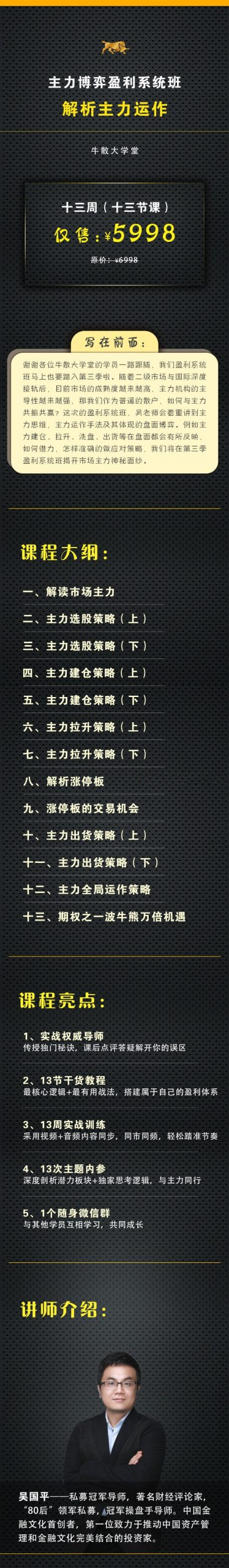 謝謝各位牛散大學堂的學員一路跟隨,我們盈利系統班馬上也要踏入第三季啦,隨著二級市場與國際深度接軌后,目前市場的戰熟度越來越高,主力機構的主導性越來越強,那我們作為普通的散戶,如何與主力共振共贏?這次的盈利系統班,吳老師會著重講到主力思維,主力運作手法及其體現的盤面博弈,例如主力建倉、拉升、洗盤、出貨等在盤面都會有所反映.如何借力,怎樣準確的做應對策略,我們將在第三季盈利系統班揭開市場主力神秘面紗