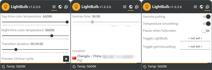 LightBulb是一款電腦屏幕色溫調(diào)節(jié)軟件,在github上開源,與知名的f.lux是同一類軟件,可以調(diào)節(jié)電腦顯示器屏幕的色溫,通過調(diào)節(jié),可以過濾藍(lán)光,減少屏幕的藍(lán)光輸出,達(dá)到護(hù)眼效果,此外,還可以根據(jù)時間自動調(diào)節(jié)顯示器屏幕顏色,讓屏幕始終處于護(hù)眼狀態(tài),適合長時間用電腦的用戶使用。