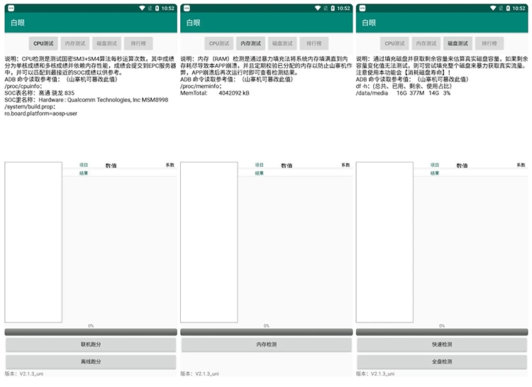 白眼 是一款非常好用的手機(jī)系統(tǒng)檢測(cè)工具,采用了C++語言編寫的,用戶可以通過它來獲取到最真實(shí)的手機(jī)數(shù)據(jù),包括CPU、內(nèi)存、磁盤都能夠測(cè)試的到,還有手機(jī)排行榜功能,非常好用,避免用戶被一些山寨機(jī)欺騙,是一款非常好用的驗(yàn)機(jī)助手。