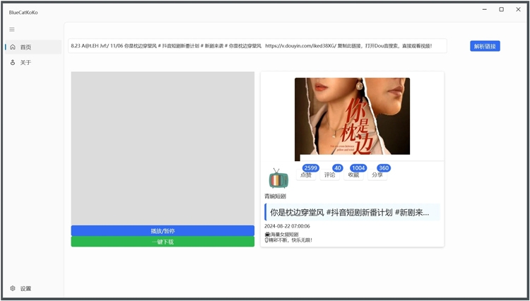 藍貓KoKo下載器(BlueCatKoKo)是一款無需登錄、操作簡便的桌面端應用,專門用于下載抖音和快手的視頻。它擁有直觀的用戶界面和順暢的操作流程,能夠下載各種視頻并將其保存為mp4格式。軟件無須獲取cookie,需要安裝net8.0.8,第一次啟動軟件時會提示,按照提示下載安裝即可。