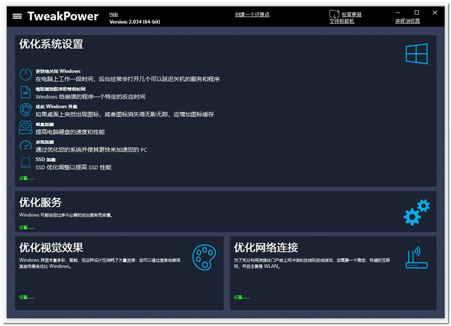 TweakPower最新版是一款來自國外的專業化電腦性能優化工具,TweakPower最新版功能強勁,支持通過修改系統設置(注冊表)從而達到提高系統運行速度的目的,讓你的電腦運行速度輕松變快。
